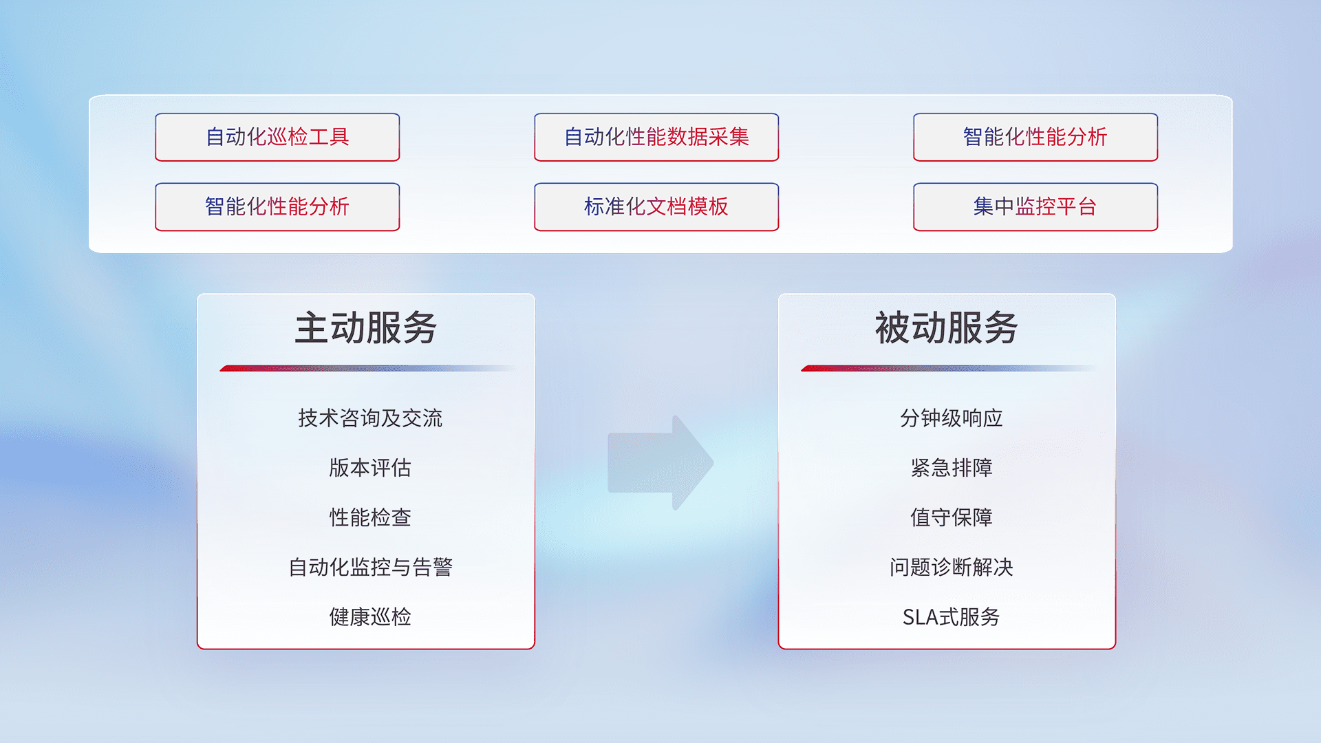智能化工具和标准化文档,,保障服务质量,,提供主动服务(包含技术咨询、、版本评估、、、性能检查、、、、自动化监控与告警、、健康巡检)和被动服务包含(分钟级响应、、、、紧急排障、、、值守保障、、问题诊断解决、、、SLA服务)。。。